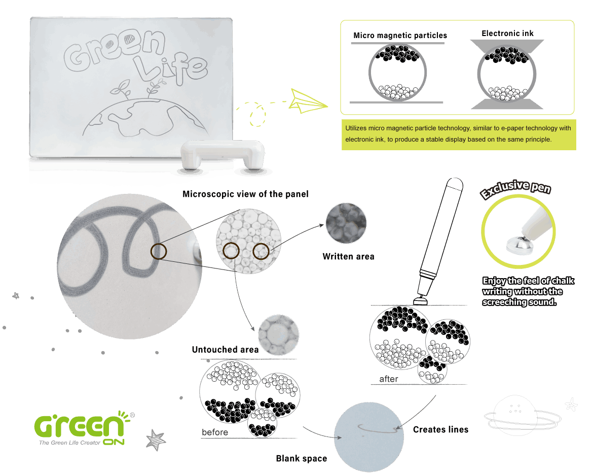 GREENBOARD磁気電子ボードはマイクロ磁気粒子技術と独自のナノテクノロジーを使用し、鉛筆のような線を実現し、ストロークが鮮明で消えることはありません。